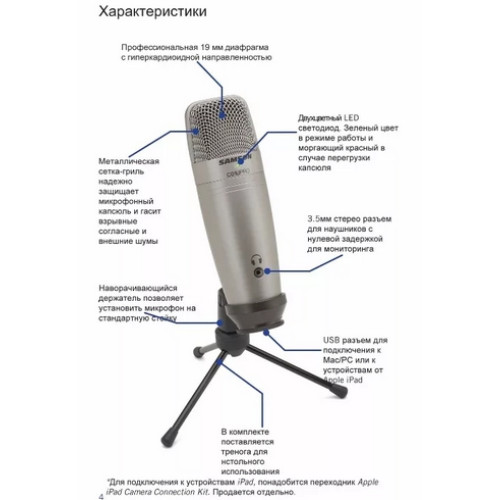 Также микрофон совместим с iPad и iPhone (4S и новее) для того чтобы обеспечить качественным звучанием любителей мобильной звукозаписи (для подключения к iPad/iPhone необходим адаптер Apple's Lightning USB Camera Adapter или 30-pin Camera Connection Kit).