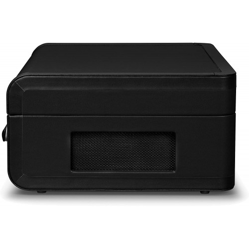 Ременной привод позволяет пластинке вращаться равномерно, а встроенные полноразмерные 6-дюймовые динамики передают звук мягко и чисто. А прямые линии корпуса, обитого искусственной кожей придают этой модели элегантности и делают из обычного проигрывателя стильный аксессуар.
