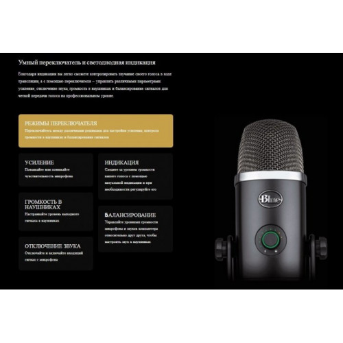 Микрофон Yeti X включает в себя передовое аудио-программное обеспечение Blue VO!CE, набор вещательных вокальных эффектов, который позволяет достичь профессионального качества звука. С Blue VO!CE вы можете заставить Yeti X звучать так, как вам нужно, используя пресеты для четкого и современного, теплого и винтажного, классического радио голоса или создать свой собственный уникальный звук.