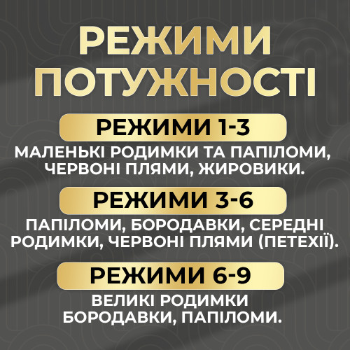 Интенсивность токовой подачи можно регулировать. Всего 9 уровня интенсивности. Самая низкая интенсивность подойдет, например, для удаления веснушек.