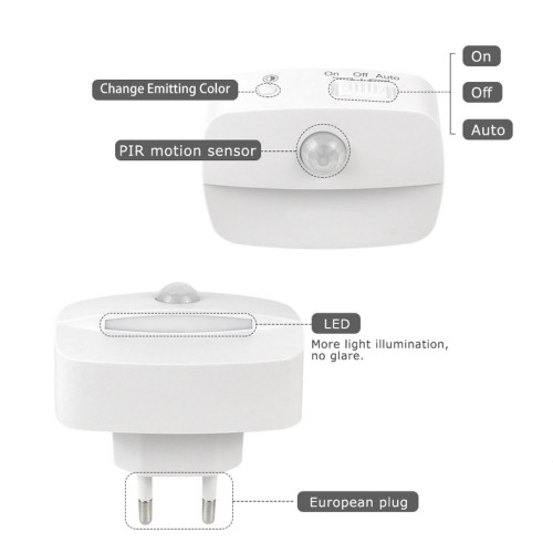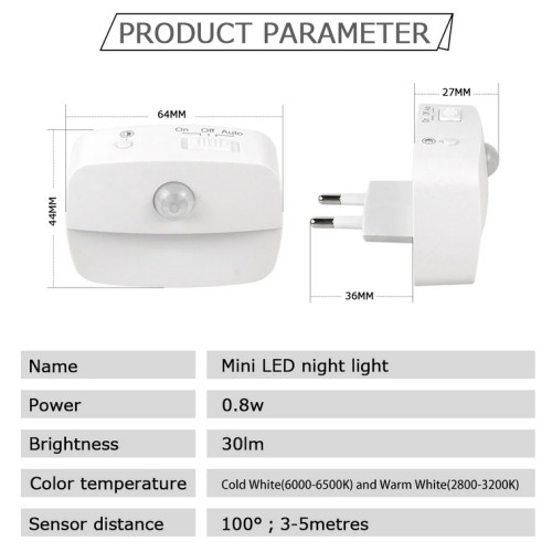 Cветильник ночник в розетку с датчиком света - идеально подойдет для освещения в коридоре или помещении в котором в ночное время должен быть хотя бы минимальный источник света. Данный девайс мощностью 0.8 ват будет весьма экономным и в то же время незаменимым помощником в повседневной жизни. А благодаря использованию инновационного датчика движения нет никакой необходимости выключать его - датчик сделает это все за Вас. Так же существует регулировка цвета освещения, а именно: теплый, холодный и средний.