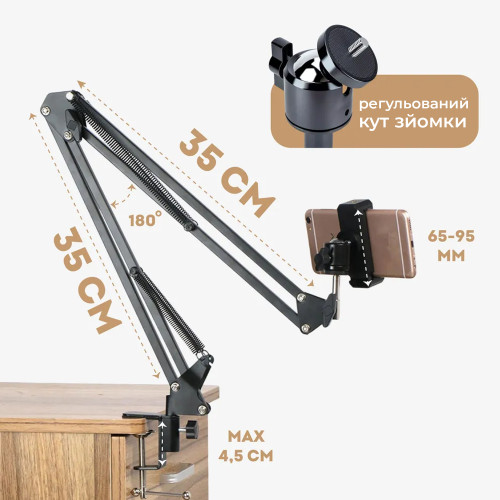 Стойка / пантограф для телефона настольная, держатель для телефона предназначена для крепления телефона к столу или другой поверхности максимальной толщиной до 45 мм и круговым обращением как стойки так и держателя для телефона.