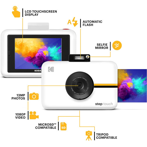 Kodak Step Touch - это 13-мегапиксельная цифровая камера для мгновенных фотографий с большим 3,5-дюймовым LCD-сенсорным экраном, стабилизацией изображения, VIDEO FULL HD 1080p камерой, режимом HDR, комбинированной функцией фотосъемки, зеркалом SELFI что разрешает печать фотографий непосредственно с телефона или планшета.
