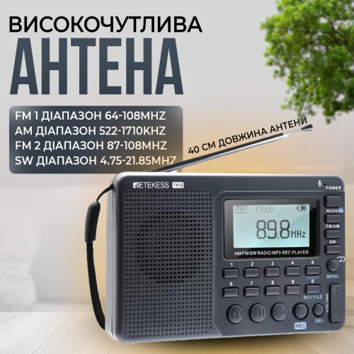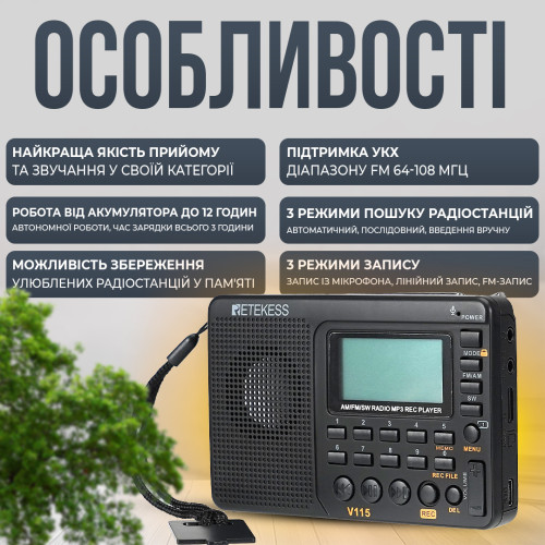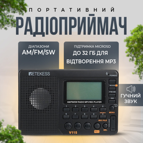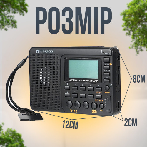 Радиоприемник цифровой портативный с аккумулятором Retekess V115 ( FM, УКВ, AM, SW, MP3, Диктофон)