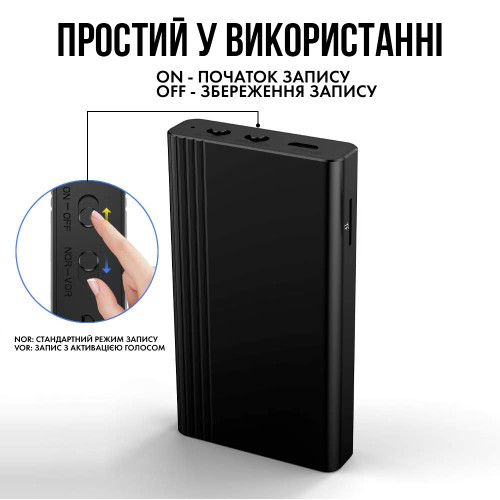 Управление этим диктофоном простое, всего двумя переключателями питания и выбора режима записи, которую возможно настроить обычную или с голосовой активацией. Его можно использовать в качестве МР3 плеера, в комплекте идёт переходник к наушникам с кнопками управления. Диктофон подключается к компьютеру, а также поддерживает OTG соединение с телефоном. Благодаря отличному исполнению и качеству данный аудио рекордер вы можете успешно использовать как в профессиональной, так и в повседневной деятельности, включая литературное и музыкальное направления.