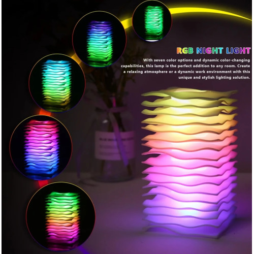 Cветильник ночник волна настольный с пультом Д/У и 8 сменными цветами - отличная находка, если Вы хотите добавить в свой интерьер больше уюта. Особенностью ночника является эффект волны, напоминающий волны на слегка взволнованной поверхности воды через которые проблескивает солнышко. Поэтому ночник будет создавать не только красоту в Вашем доме, но и добавит спокойствия.