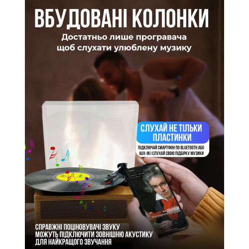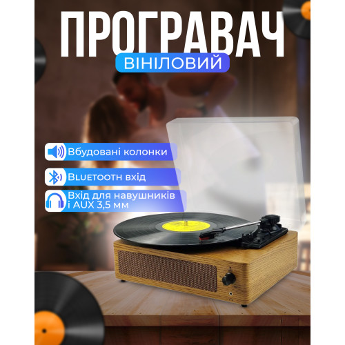 Проигрыватель виниловых пластинок с 2 стереодинамиками 3-х скоростной 33/45/78 об/мин дерево T06A c Bluetooth