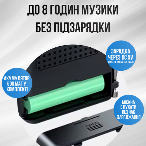 Оснащен литиевым аккумулятором емкостью 500 мАч.