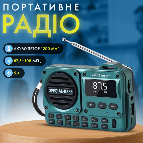 Радиоприемник / Bluetooth-колонка с аккумулятором LED дисплей JOC H456BT ( FM, USB, MP3, MicroSD) - это цифровой радиоприемник, предназначенный для приема радиостанций в диапазонах FM, а также использовать для проигрывания музыки с помощью USB и MicroSD. Поддерживается карта пяти микроSD (TF) объемом до 32 ГБ. Радиоприемник поддерживает файлы в формате MP3 и возможность прослушивания через наушники. Так же он имеет сьемный аккумулятор тип 18650, мощностью 1200мАч.