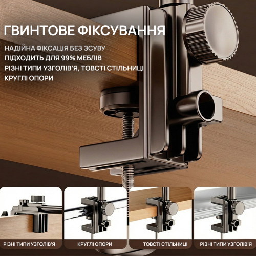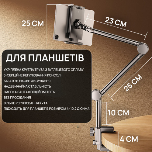 Стойка / пантограф, настольный держатель для планшета и телефона предназначена для крепления телефона и планшета к столу или другой поверхности максимальной толщиной до 40 мм и круговым обращением как стойки так и держателя для планшета.